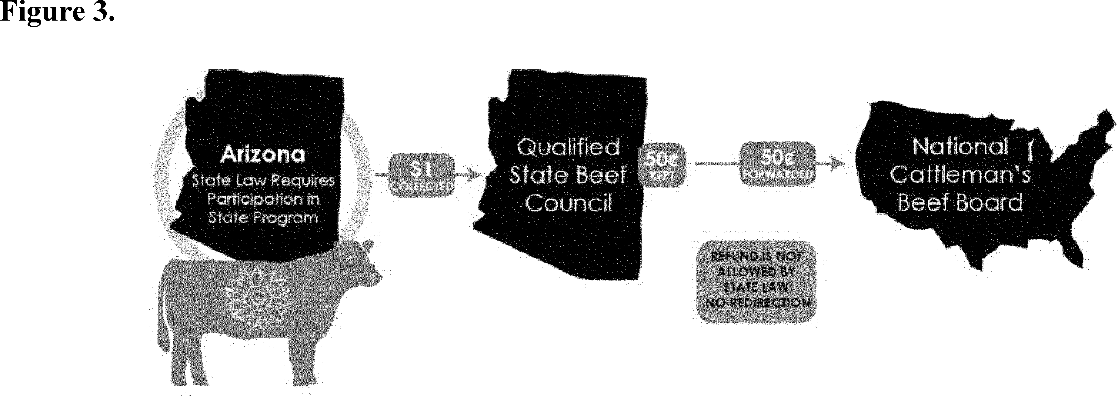 - Example 3—States with a State Law that Does Not Authorize Refunds: A producer in Arizona pays $1.00 in assessments for a cattle sale. The Arizona Beef Council collects $1.00, keeps $0.50, and forwards $0.50 to the Beef Board. Arizona law compels the collection of the $1.00-per-head assessment and does not provide for a refund. The producer may not request the Arizona Beef Council to redirect any portion of the $0.50 to the Beef Board. This example is depicted in Figure 3.