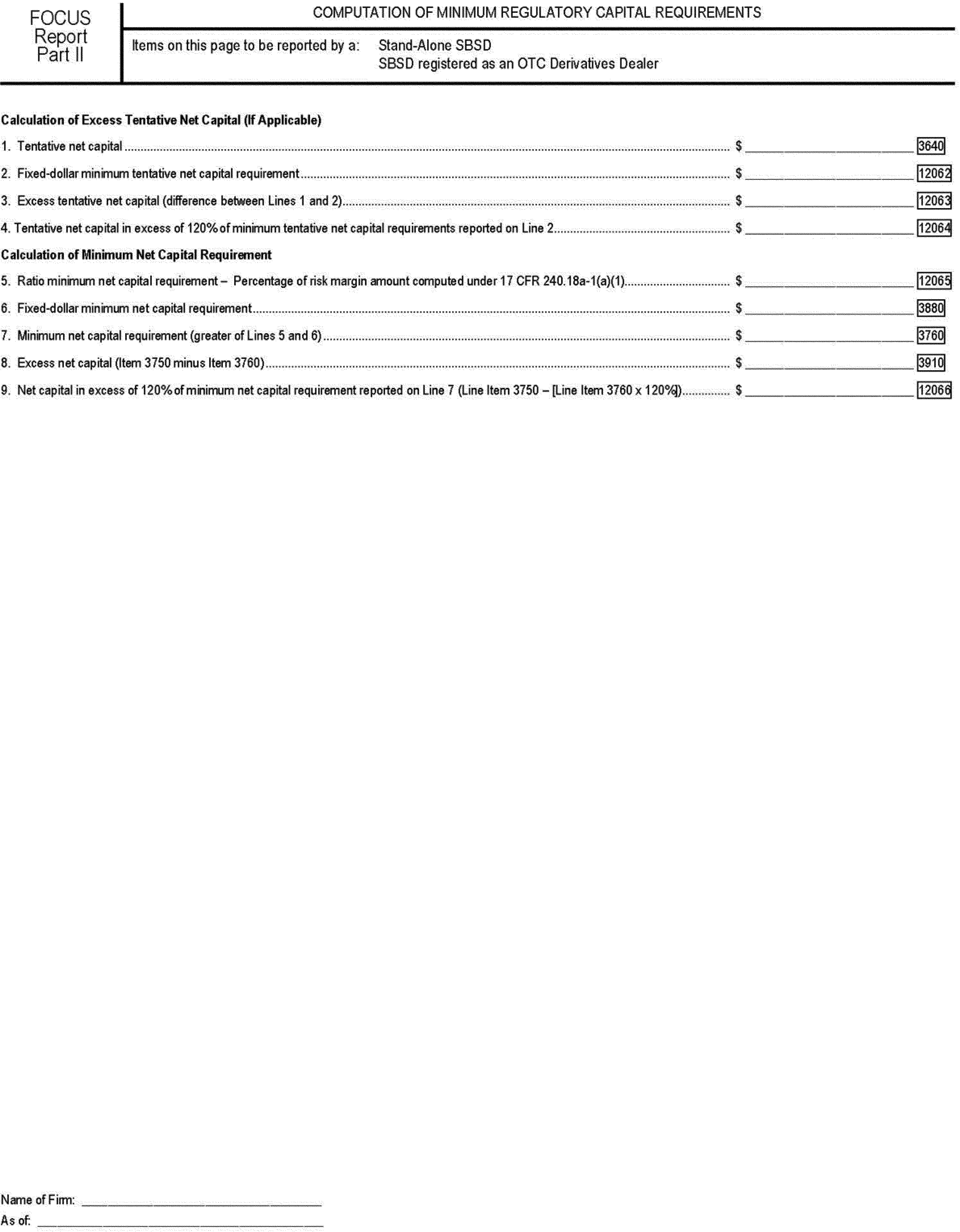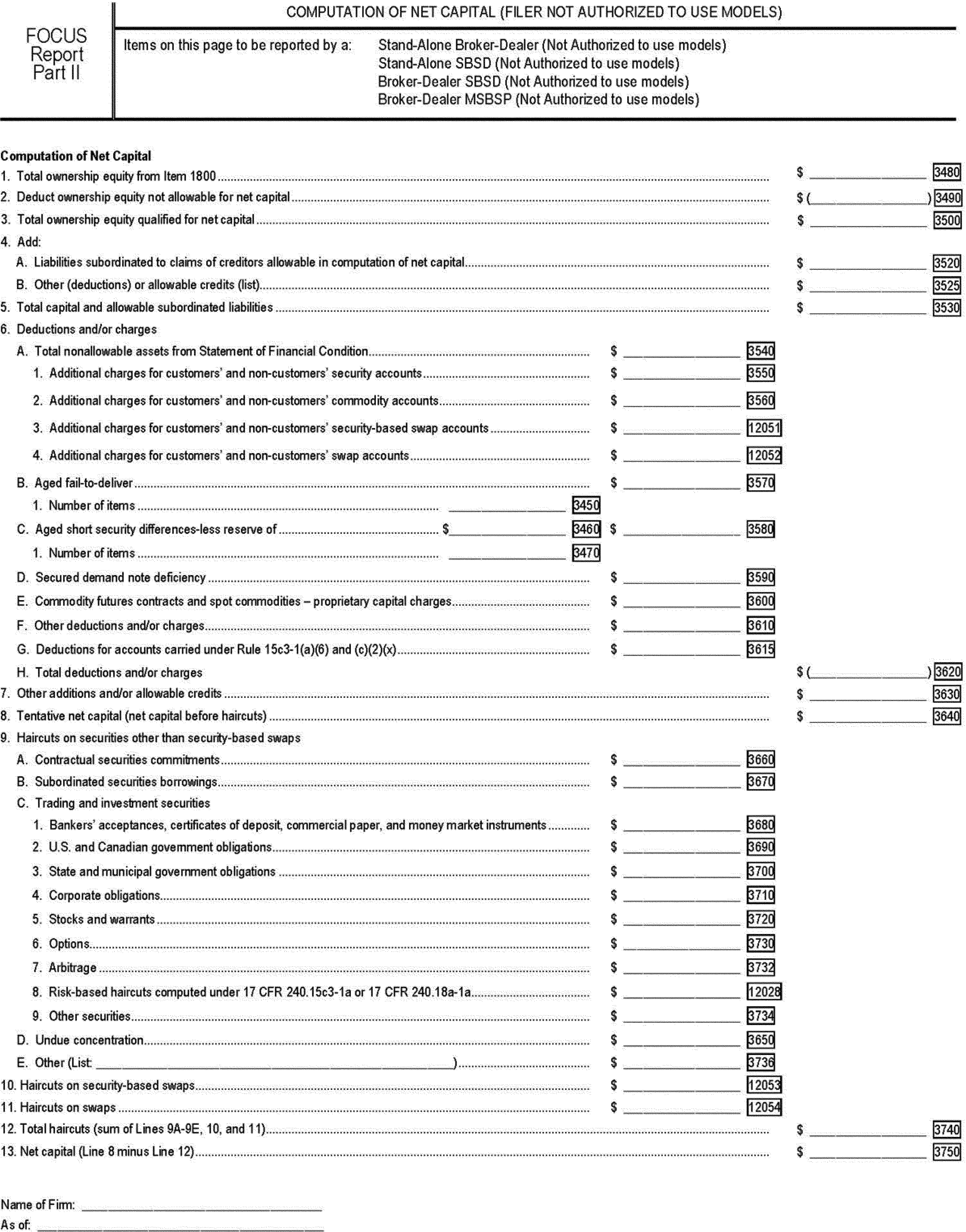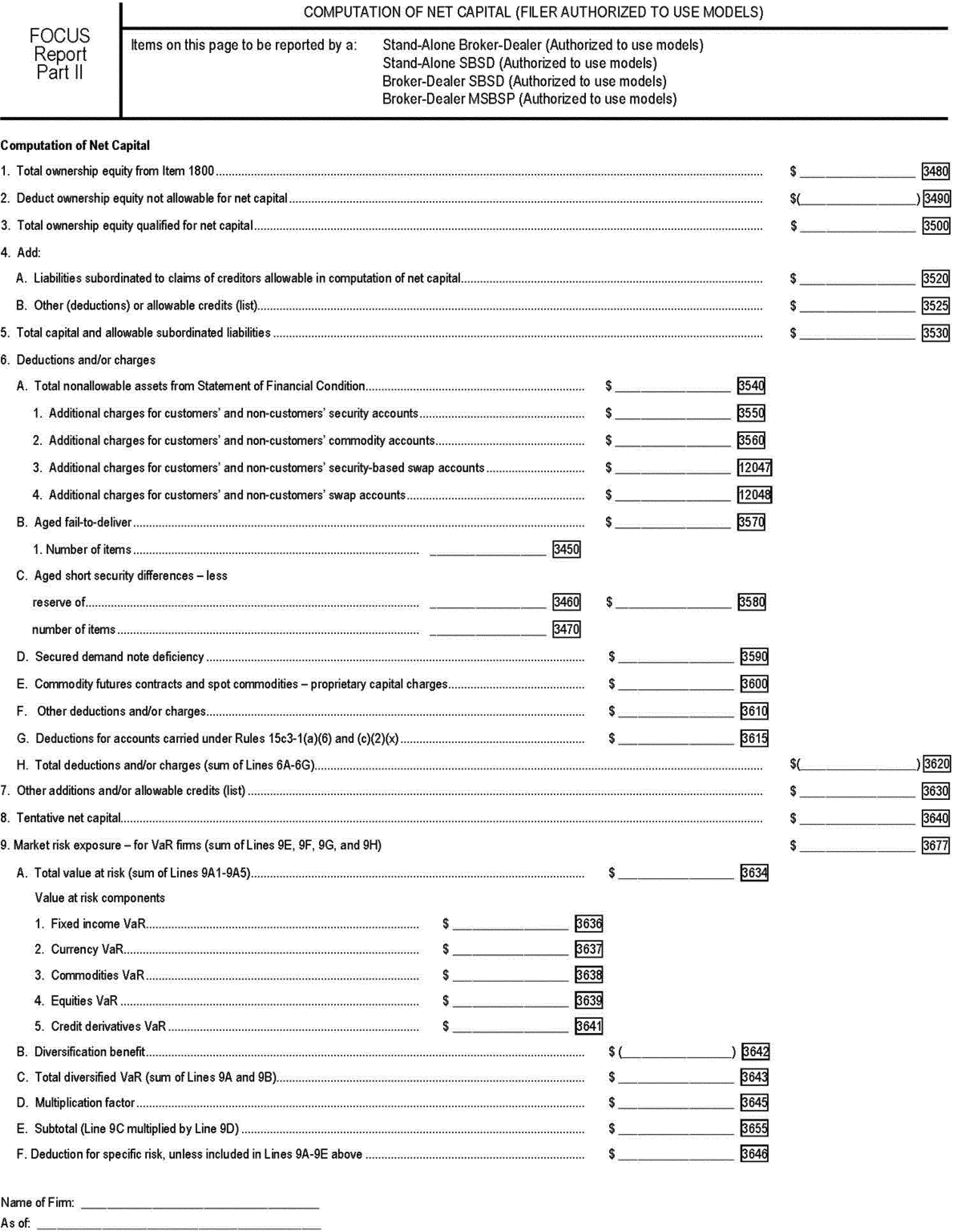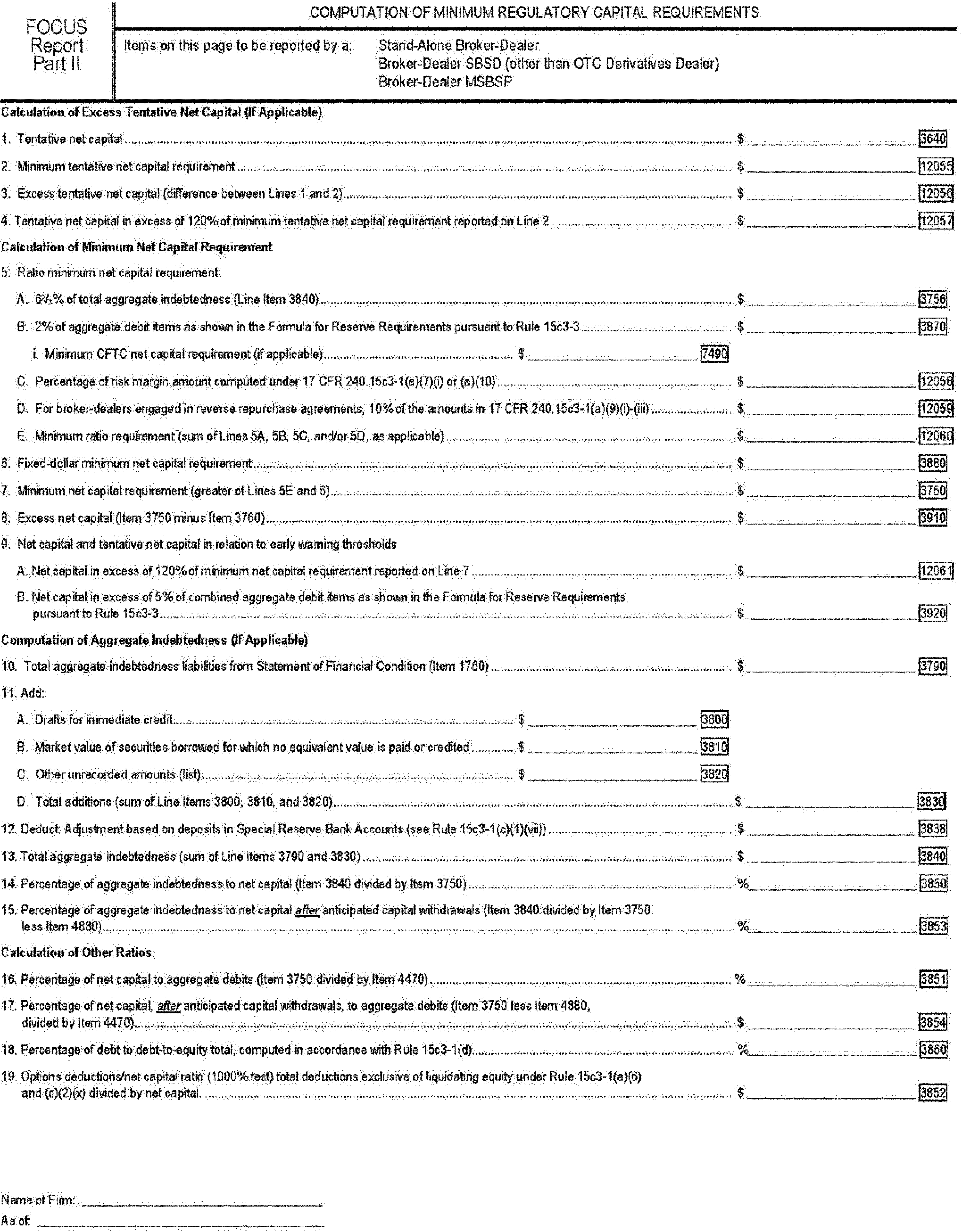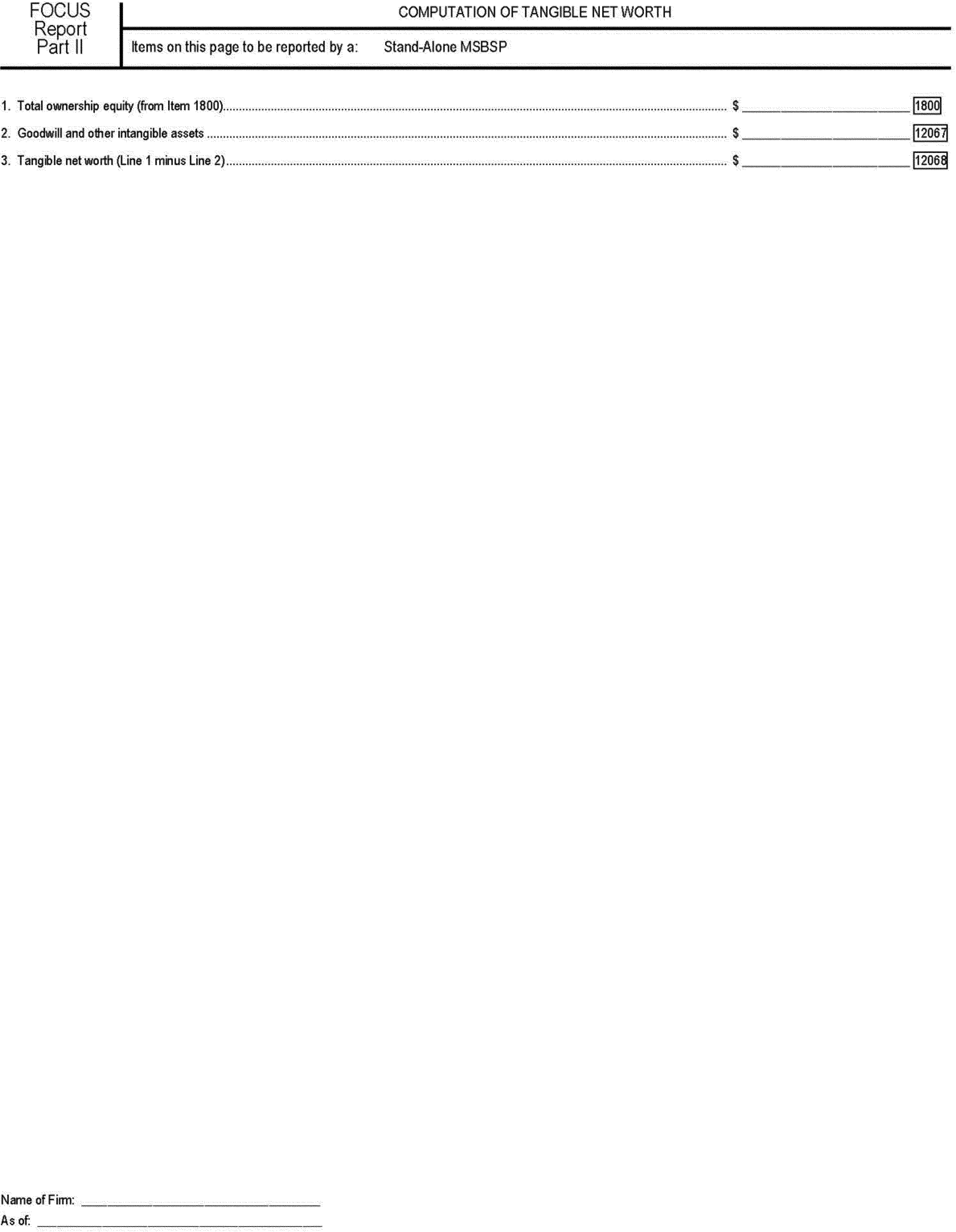 Back to Citation915. Compare FOCUS Report Part II, as amended, Computation of Tangible Net Worth, with FOCUS Report Part II, as amended, Computation of Net Capital (Filer Authorized to Use Models) and FOCUS Report Part II, as amended, Computation of Minimum Regulatory Capital Requirements (Non-Broker-Dealer SBSD).