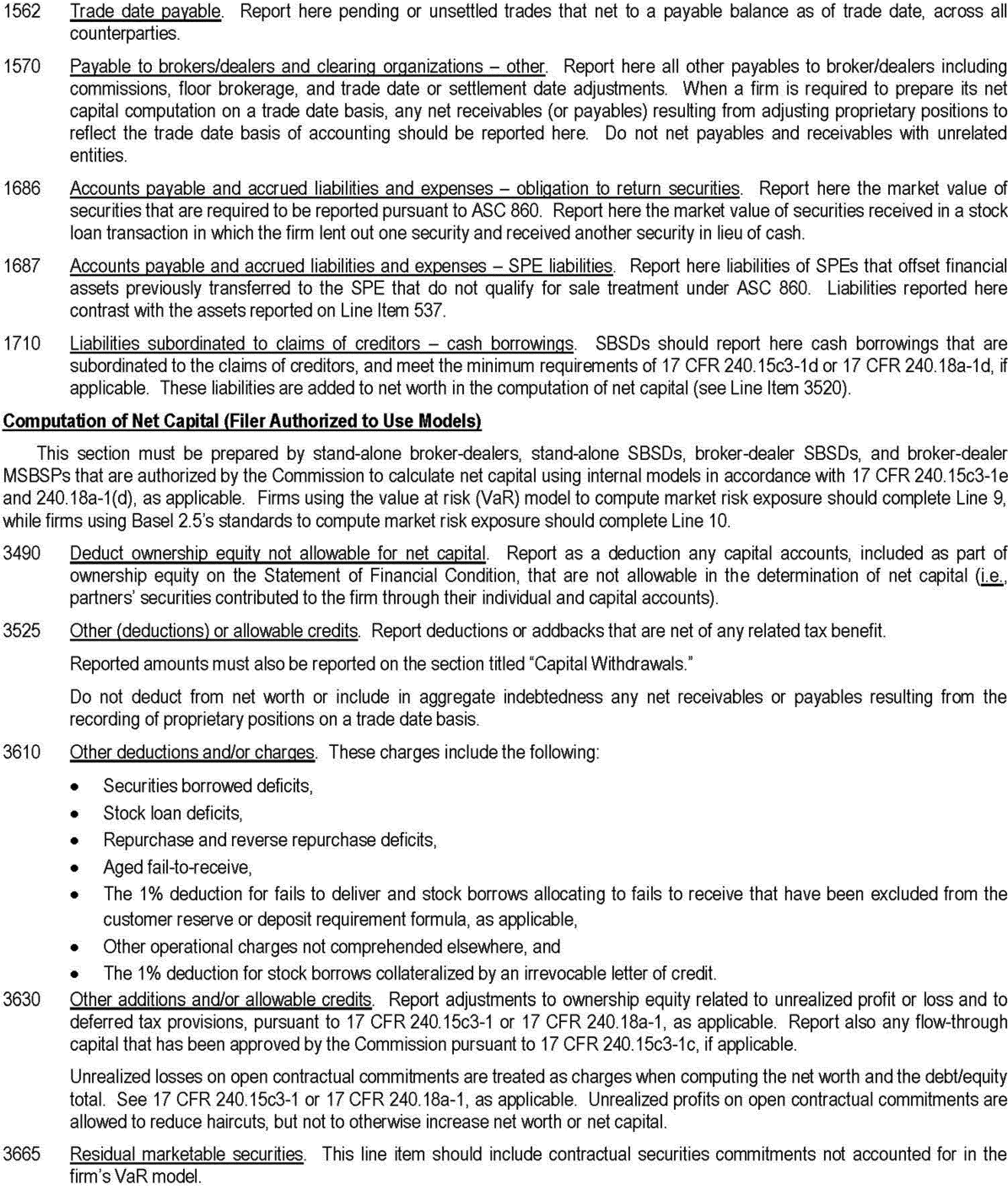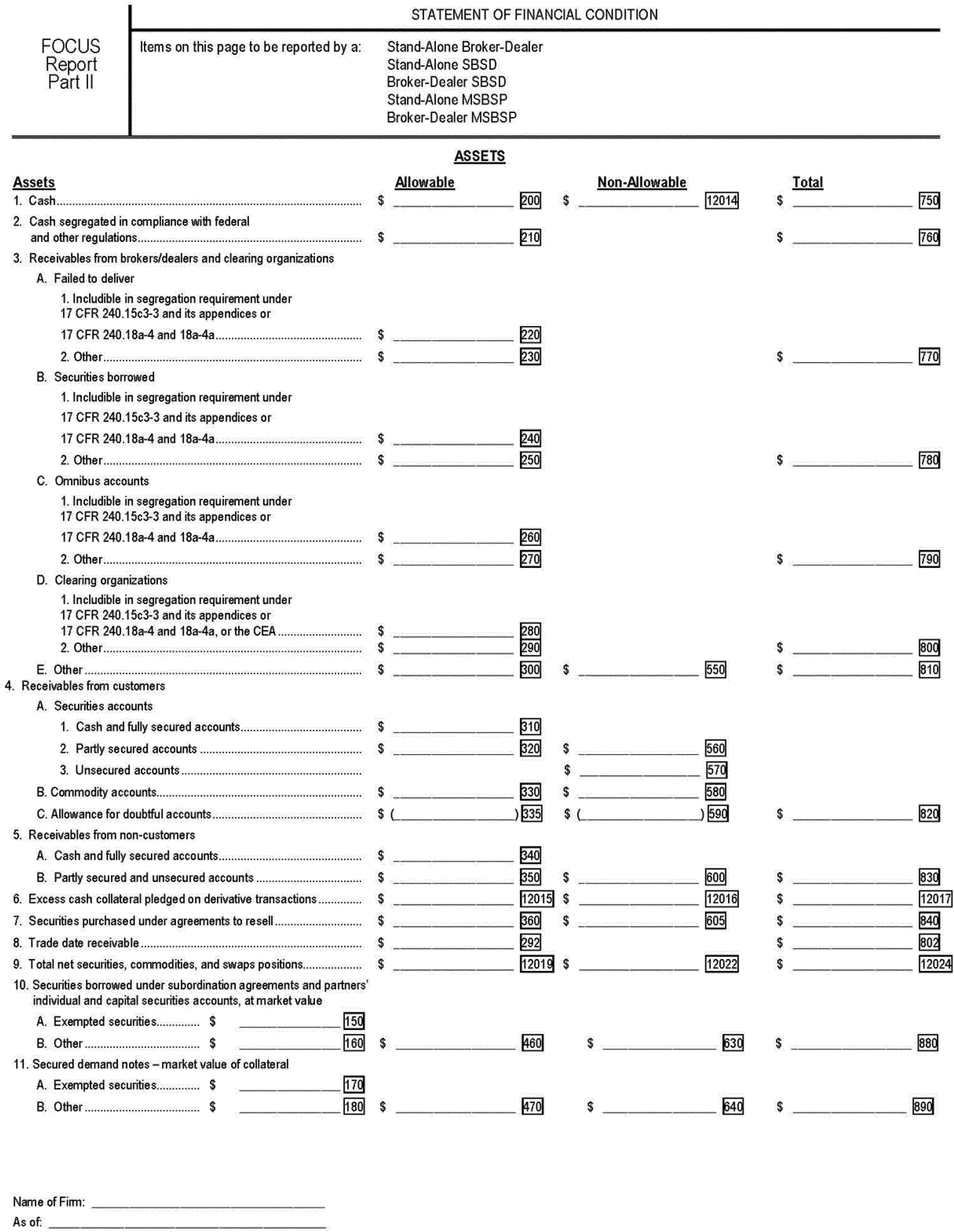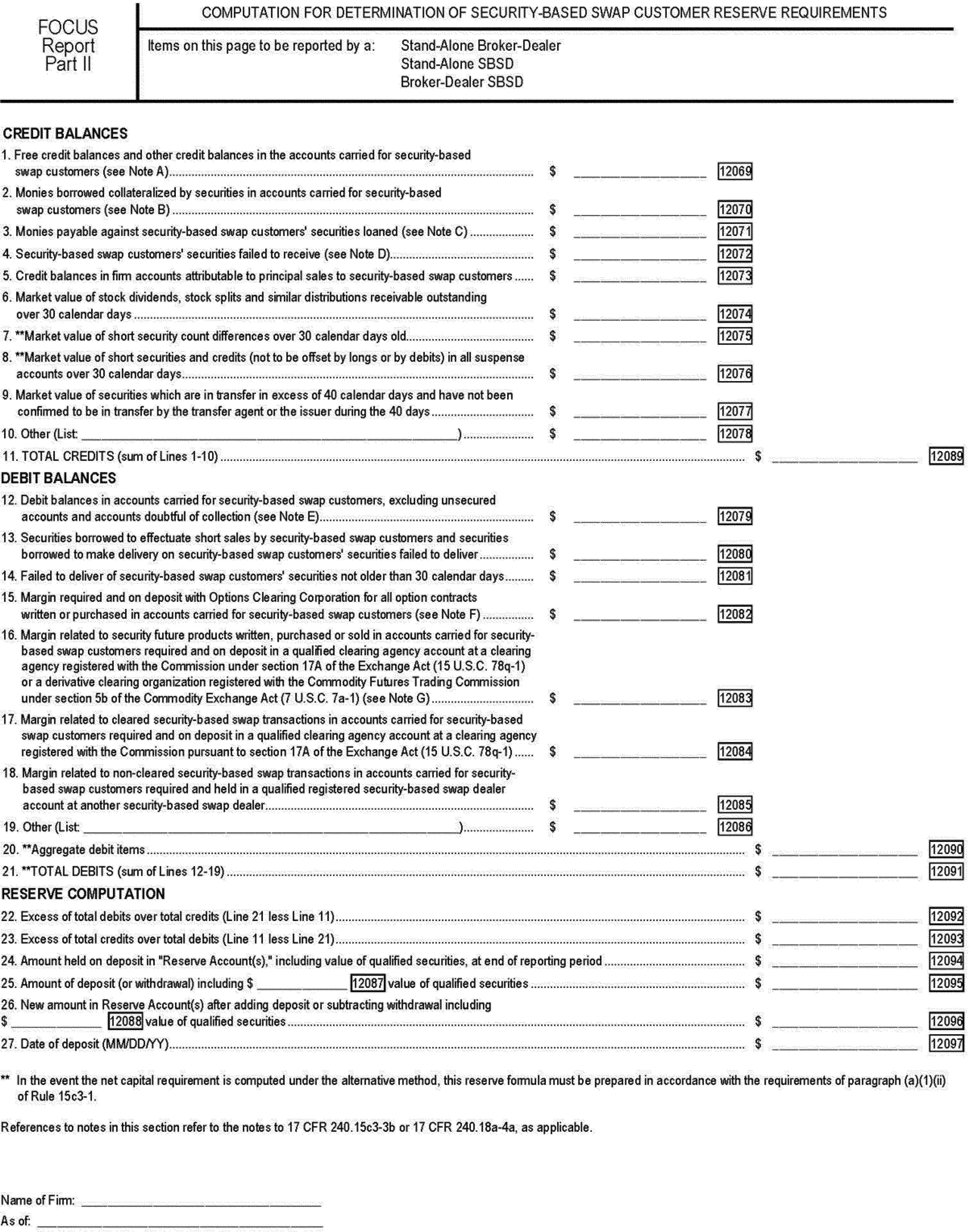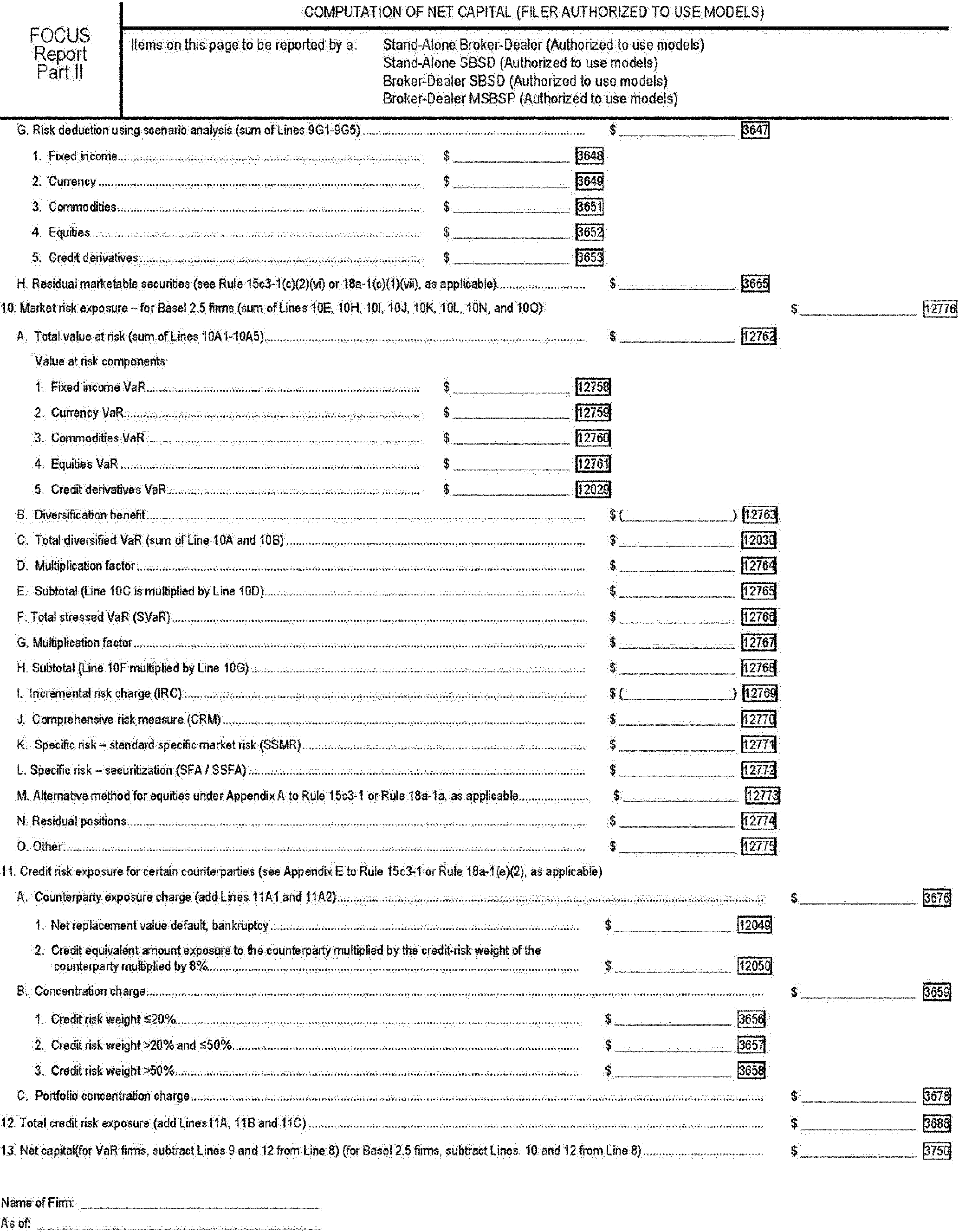 Back to Citation915. Compare FOCUS Report Part II, as amended, Computation of Tangible Net Worth, with FOCUS Report Part II, as amended, Computation of Net Capital (Filer Authorized to Use Models) and FOCUS Report Part II, as amended, Computation of Minimum Regulatory Capital Requirements (Non-Broker-Dealer SBSD).