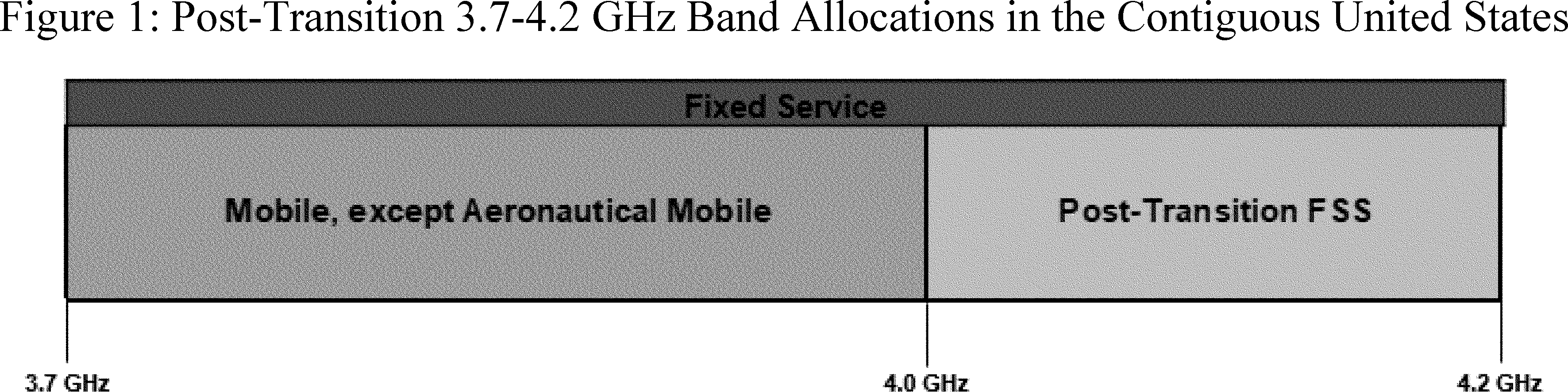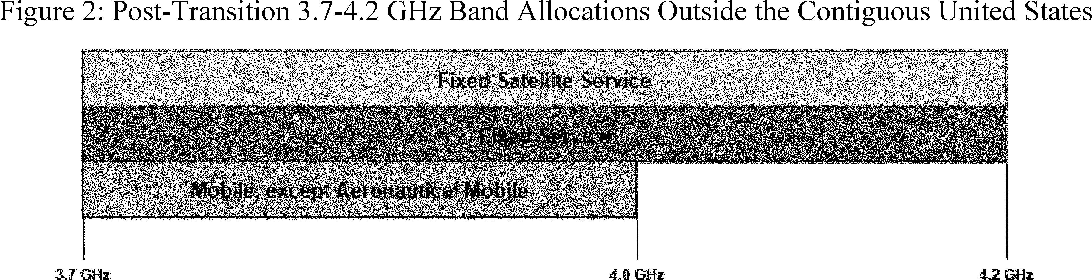 47. The Commission's plan will ensure that content that FSS now delivers to incumbent earth stations will continue uninterrupted as an essential element of the transition mechanism. Although the Commission allocates the 3.98-4.0 GHz band to mobile services, except aeronautical, for flexible use, the Commission declines at this time to establish service rules for that band. Instead, it will function as a guard band to protect earth station registrants from harmful interference both during and after the transition. The Commission also declines to add a mobile allocation to the 4.0-4.2 GHz band reserved for primary FSS use at this time, as doing so could undermine investment in content distribution. Figures 1 and 2 below demonstrate the post-transition allocation and uses of the band in the contiguous United States and in the rest of the United States, respectively.