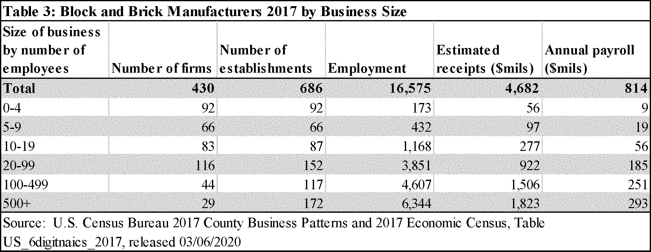 To identify the affected industry, the Department used statistics for the North American Industry Classification System (NAICS) code 327331, concrete block and brick manufacturing. This industry includes the manufacturers of concrete architectural block, concrete and cinder blocks, concrete bricks, concrete patio block, concrete paving block, precast terrazzo plinth blocks, precast concrete block and brick, prestressed concrete blocks or bricks, and slumped brick.[1] The Department believes this NAICS classification most closely corresponds to manufacturers of the broader category of concrete masonry products.